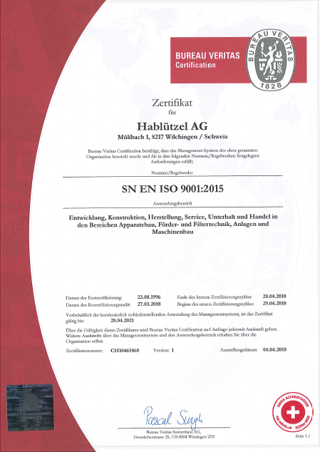 Die Hablützel AG liefert Qualität. Deshalb ist sie bereits seit 1996 durch das Bureau Veritas zertifiziert.