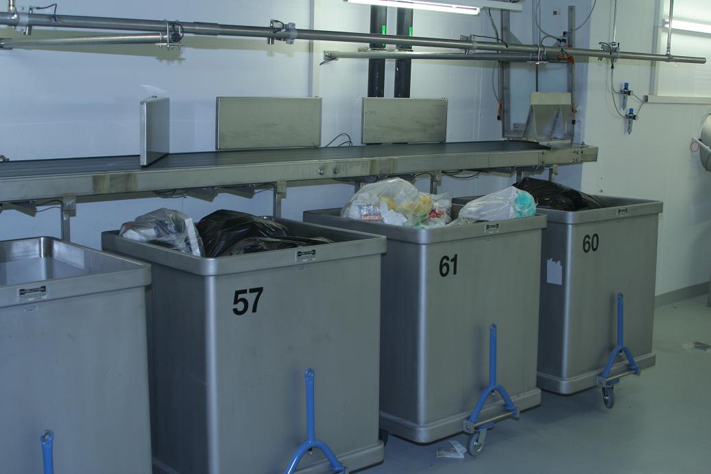 Um die Kapazität der Anlage zu vergrössern können über Förderbänder die Säcke auf Press- oder Normcontainer verteilt werden.