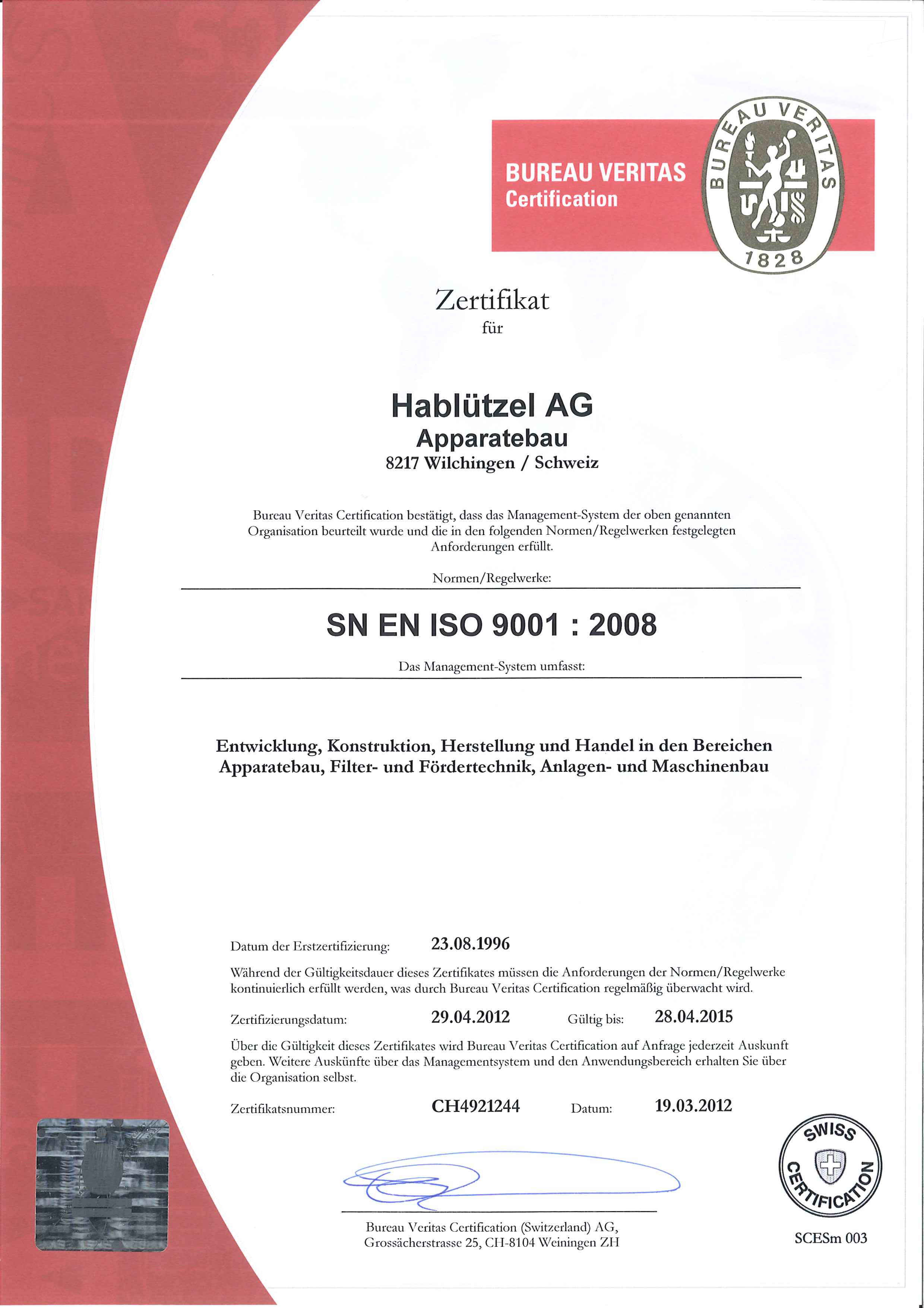Die Hablützel AG liefert Qualität. Deshalb ist sie bereits seit 1996 durch das Bureau Veritas zertifiziert.