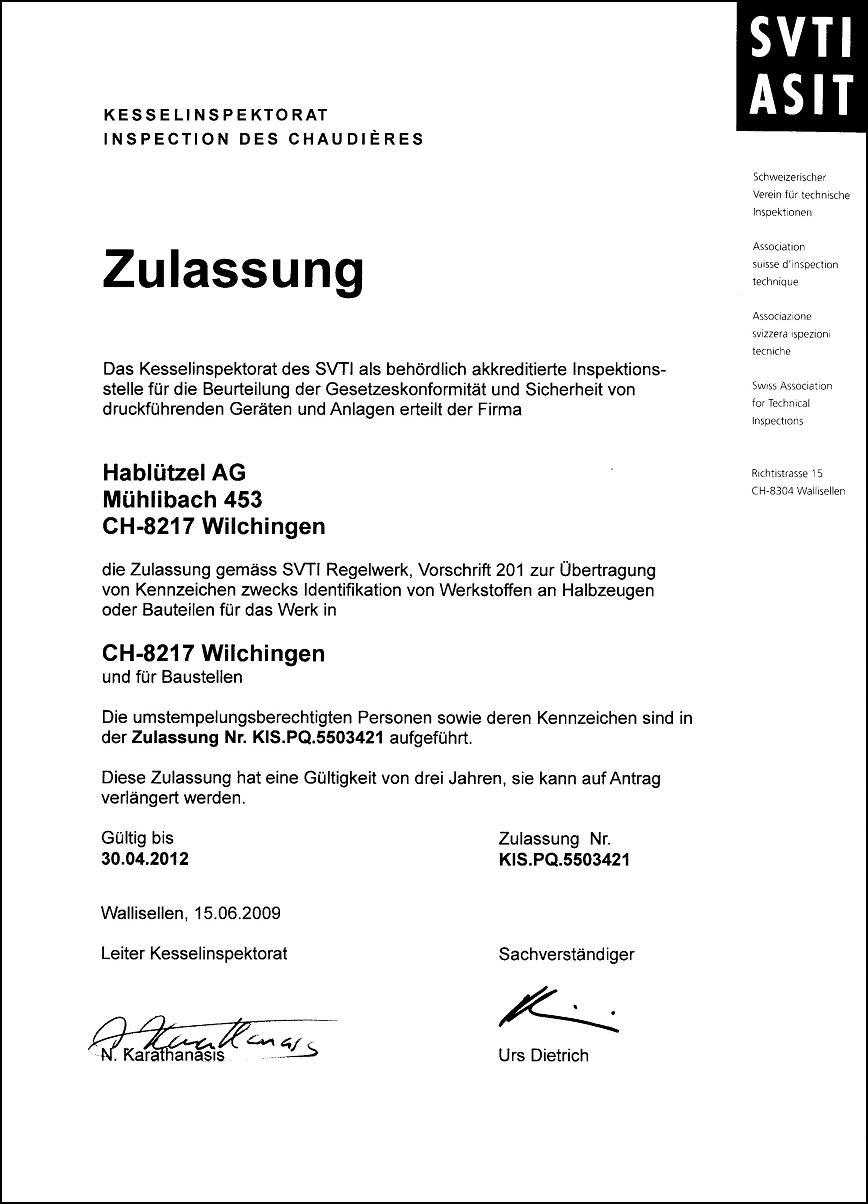 Zulassung des SVTI (Schweizerischer Verein für Technische Inspektionen).