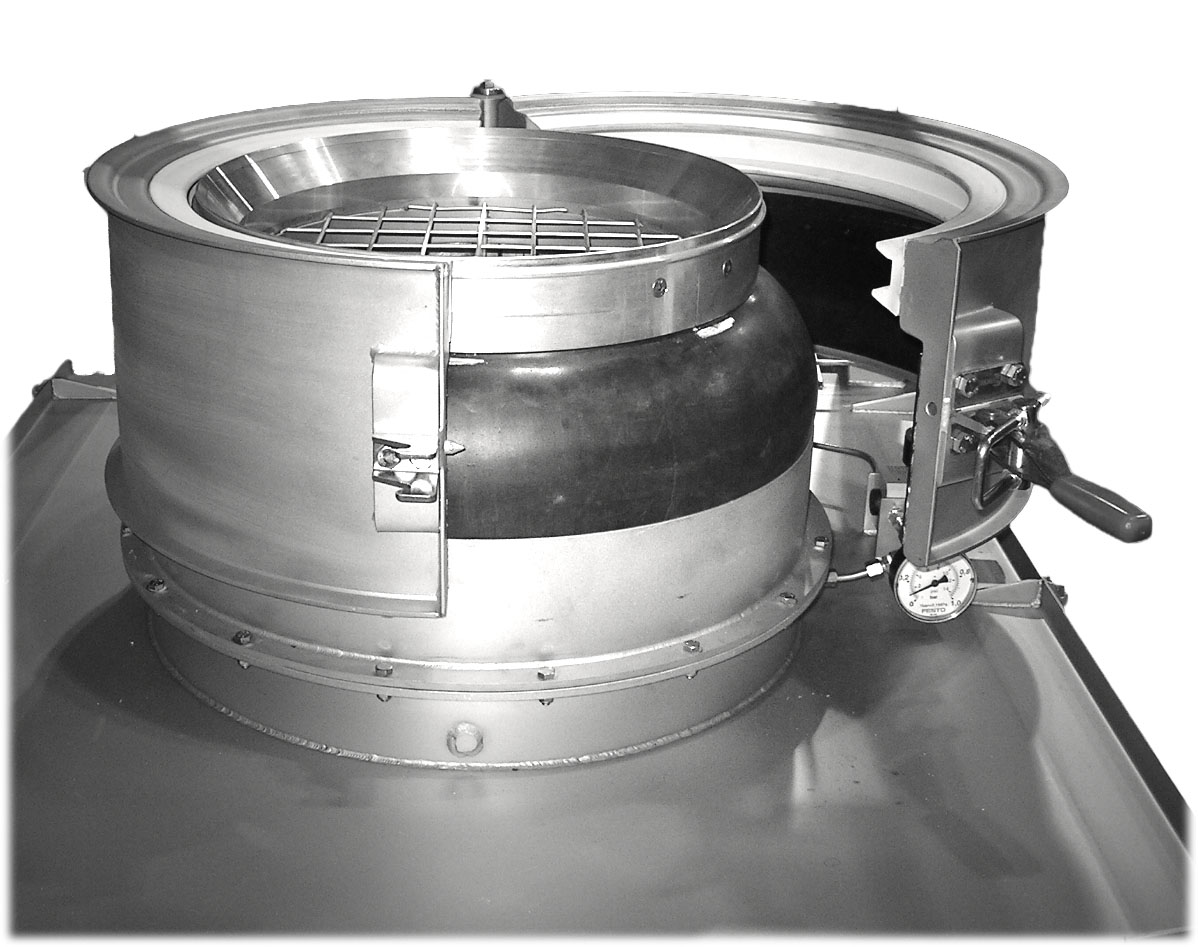 Eine Automatik sorgt dafür, dass beim Schliessen der Schlauch aufgeblasen wird. Der Schlauch dichtet den Big-Bag gegen das Einfüllrohr ab. Der Big-Bag wird geöffnet und ist betriebsbereit. Die Abdichtung ist 100% dicht, auch dann, wenn ein Überdruck im Big-Bag herrscht.